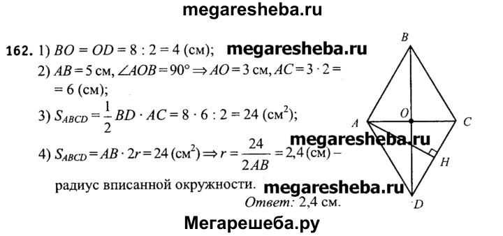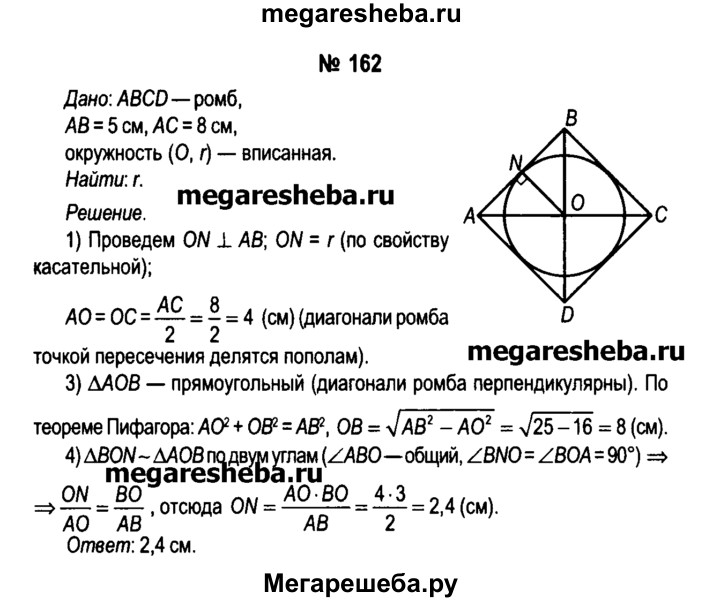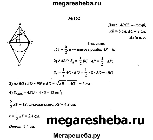 162. Около окружности описан ромб, длина стороны которого равна 5 см, а длина одной из диагоналей равна 8 см. Вычислите радиус окружности