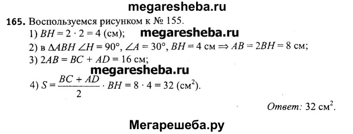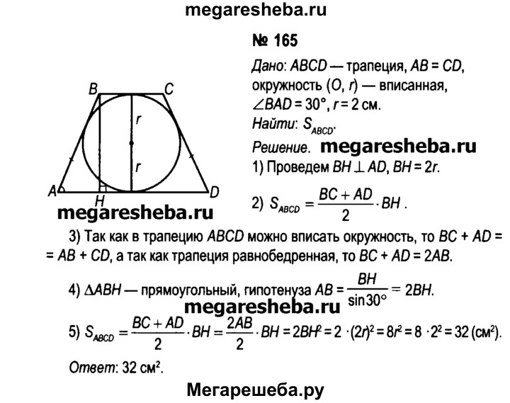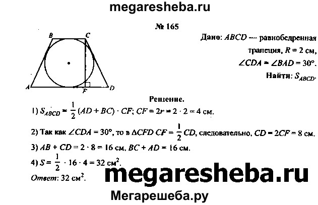 165. Около окружности радиуса 2 см описана равнобедренная трапеция, градусная мера острого угла которой равна 30°. Вычислите площадь трапеции.