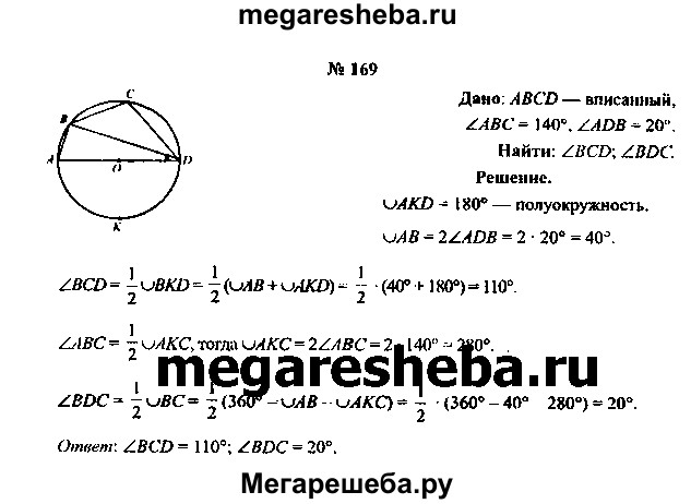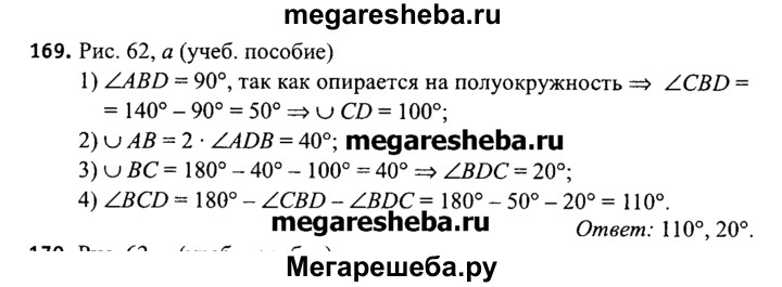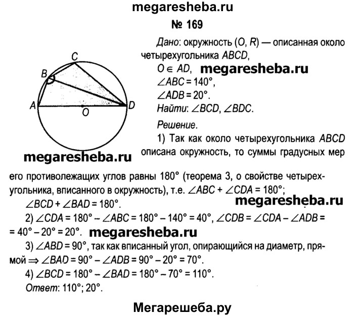 169. В окружность вписан четырехугольник ABCD. Центр О окружности лежит на стороне AD. Вычислите градусные меры углов BCD и BDC, если угол ABC = 140°, угол ADB = 20° (рис. 62, а).