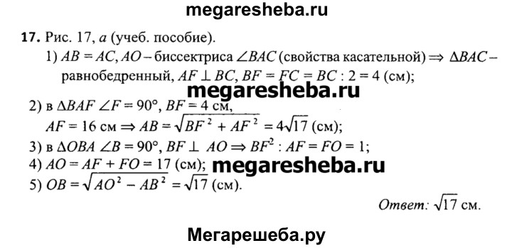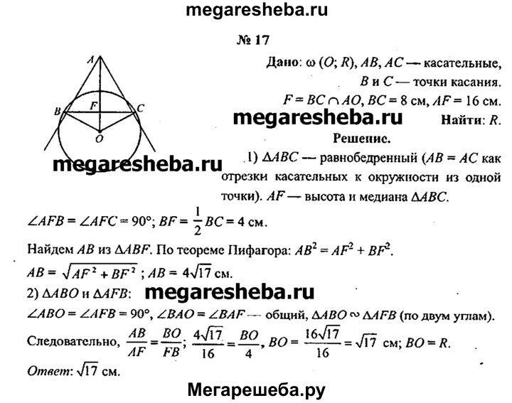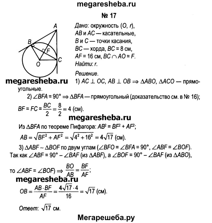 17. Через точку А к окружности, центром которой является точка О, проведены две касательные АВ и АС, где В и С — точки касания. Хорда ВС пересекает отрезок OA в точке F, Вычислите радиус окружности, если длина хорды ВС равна 8 см, а длина отрезка AF равна 16 см (рис. 17, а).