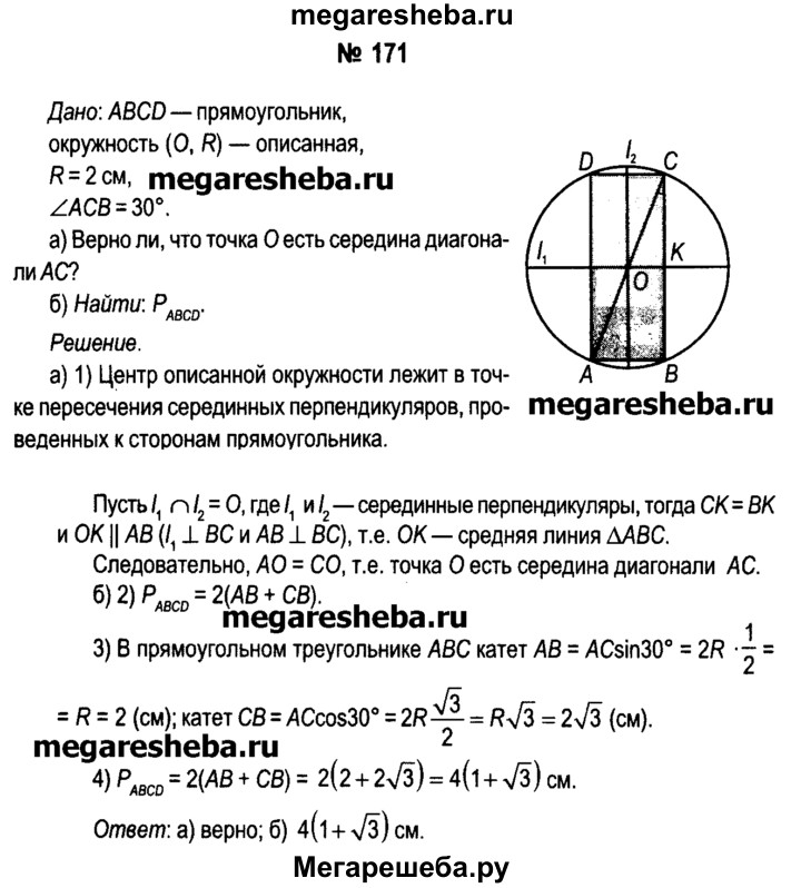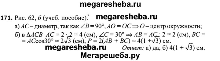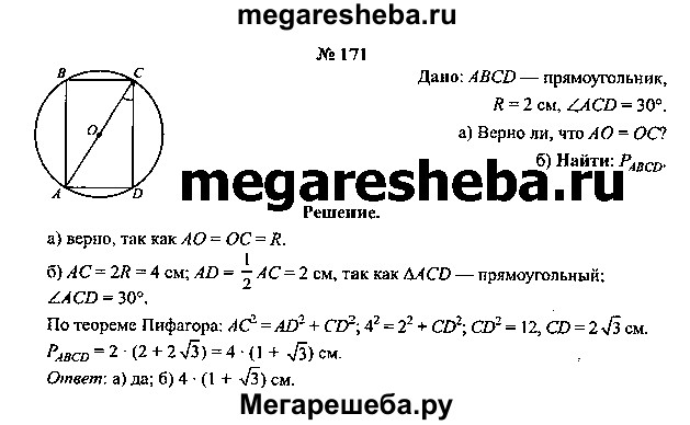171. В окружность с центром в точке О вписан прямоугольник ABCD (рис. 62, б). а) Верно ли, что точка О является серединой диагонали АС? б) Вычислите периметр прямоугольника, если радиус описанной окружности равен 2 см, а диагональ прямоугольника образует со стороной угол, градусная мера которого равна 30°.