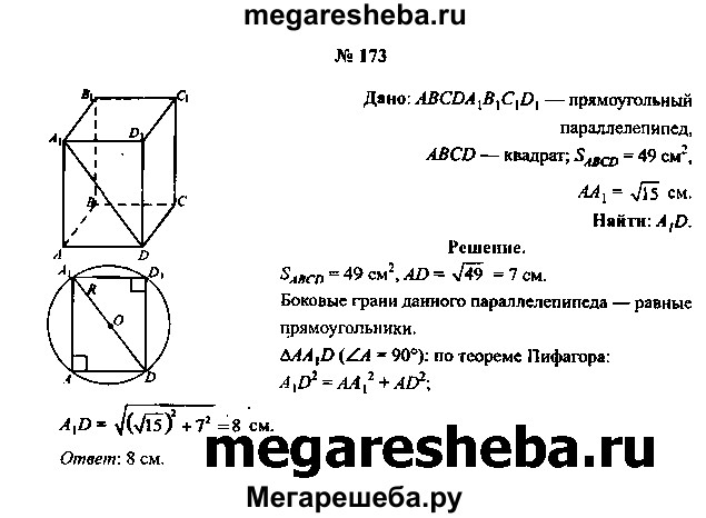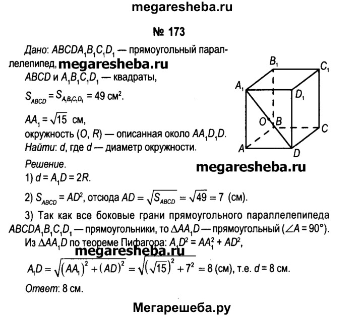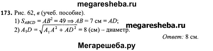 173. Основанием прямоугольного параллелепипеда ABCDA1B1C1D1 является квадрат, площадь которого равна 49 см2 (рис. 62, в). Вычислите диаметр окружности, описанной около боковой грани параллелепипеда, если длина бокового ребра равна √15см.