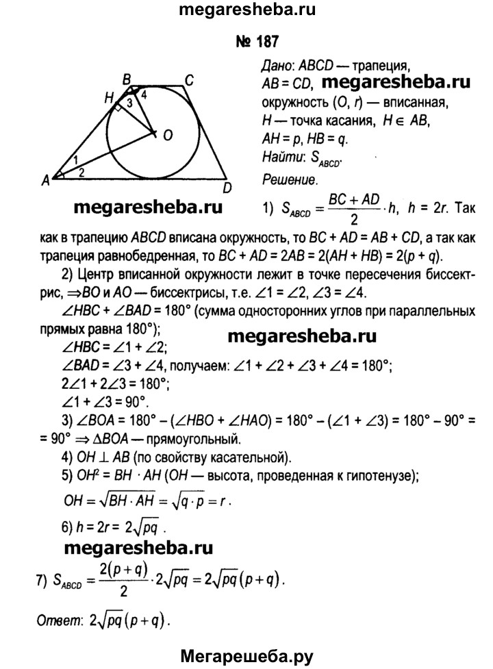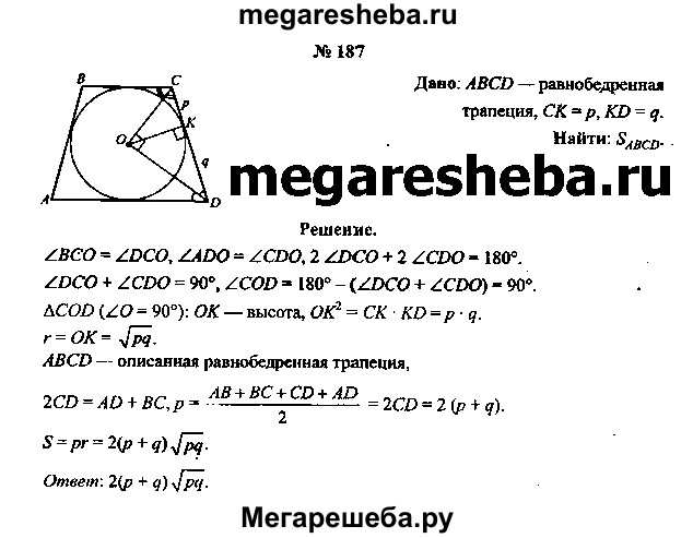 187. В равнобедренную трапецию вписана окружность. Боковая сторона трапеции делится точкой касания на отрезки, длины которых равны р и q. Найдите площадь трапеции.