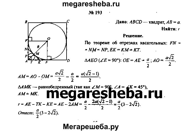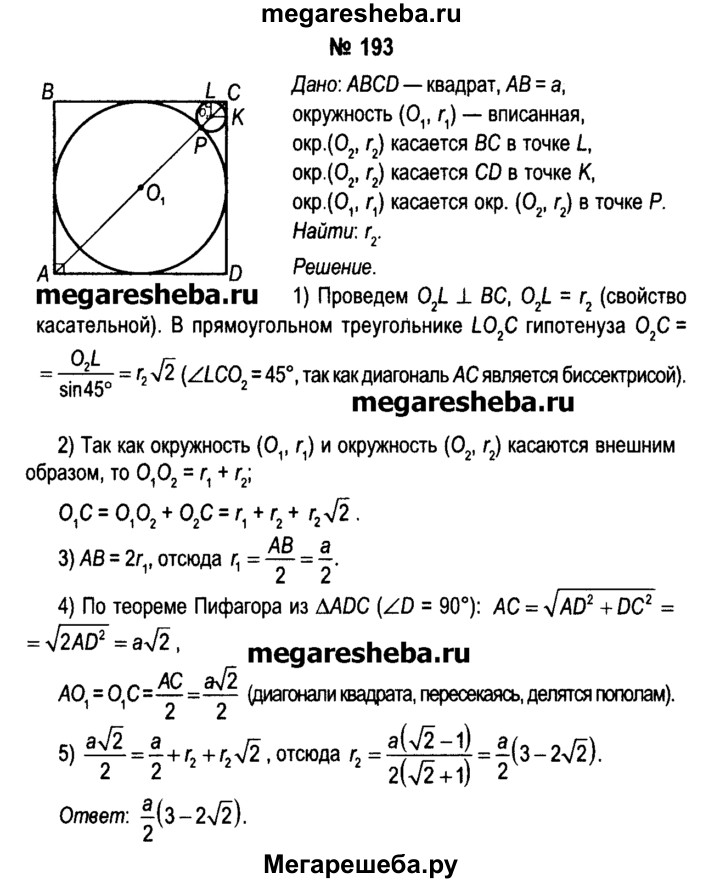 193. В квадрат вписана окружность. Другая окружность касается двух сторон квадрата и касается внешним образом вписанной в него окружности. Найдите радиус меньшей окружности, если длина стороны квадрата равна а.