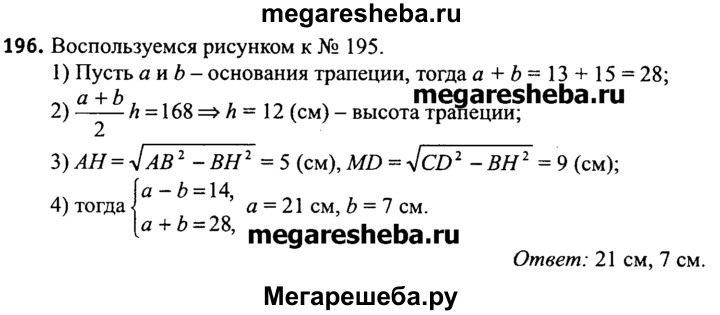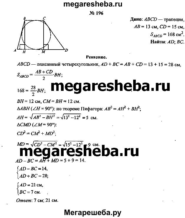 196. Около окружности описана трапеция, длины боковых сторон которой равны 13 см и 15 см, а площадь равна 168 см2. Вычислите длины оснований трапеции.