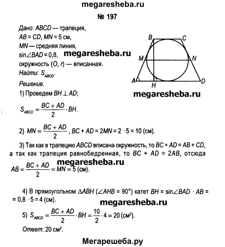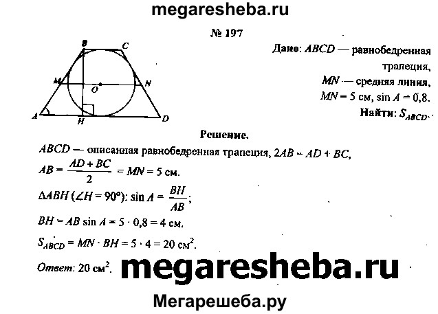 197. Около окружности описана равнобедренная трапеция, длина средней линии которой равна 5 см, а синус острого угла при основании 0,8. Вычислите площадь трапеции.