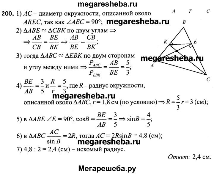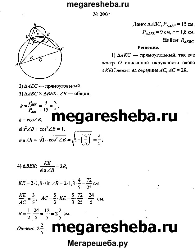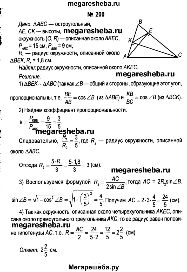 200*. В остроугольном треугольнике ABC проведены высоты АЕ и СК. Вычислите радиус окружности, описанной около четырехугольника АКЕС, если известно, что периметр треугольника АBС равен 15 см, периметр треугольника ВЕК равен 9 см, а радиус окружности, описанной около треугольника ВЕК, равен 1,8 см.