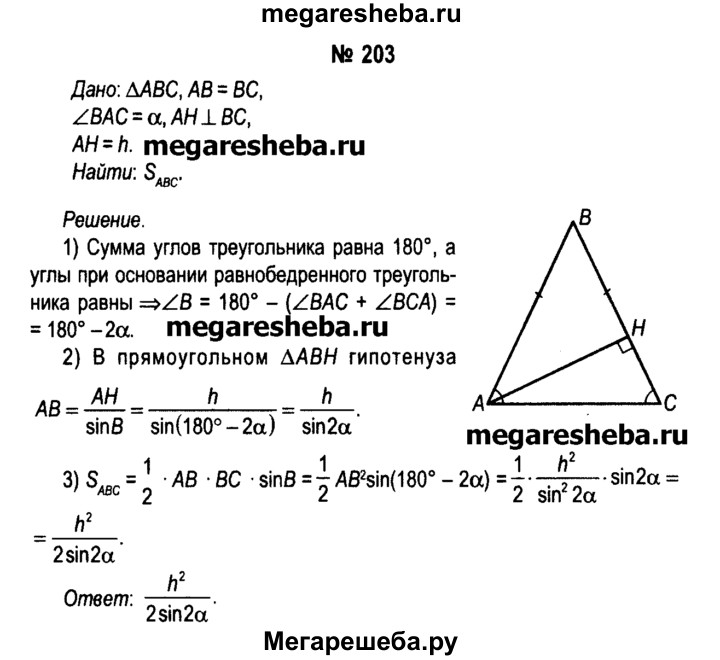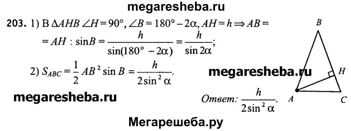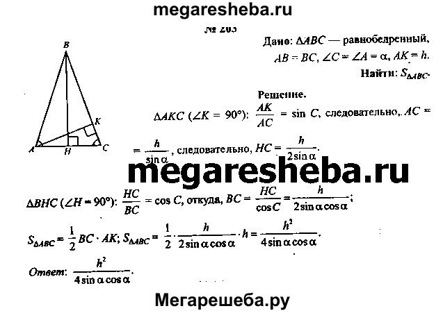 203. В равнобедренном треугольнике градусная мера угла при основании равна α, а высота, проведенная к боковой стороне, равна h. Найдите площадь треугольника
