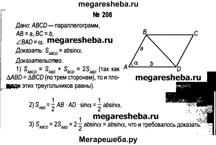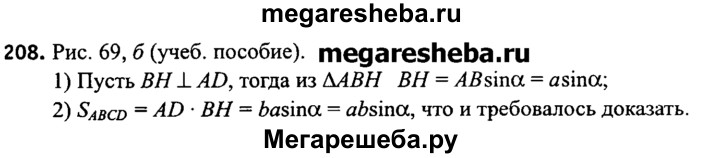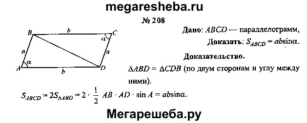 208. Докажите, что площадь параллелограмма ABCD равна произведению длин а и b его смежных сторон на синус угла α между ними, т. е. Sabcb = ab sin α (рис. 69, б).