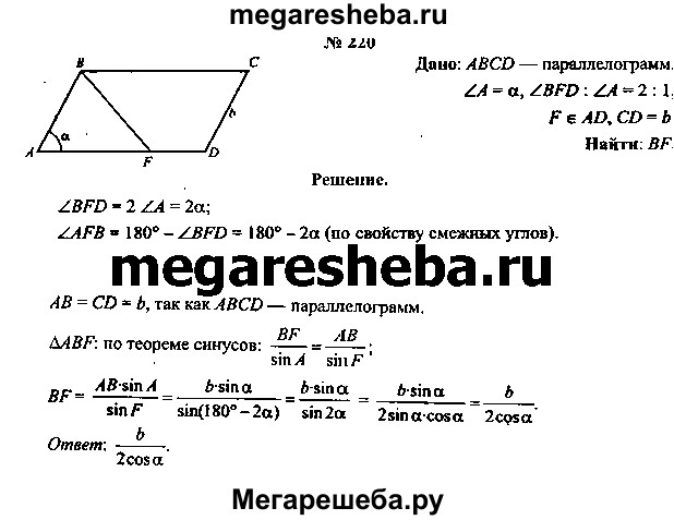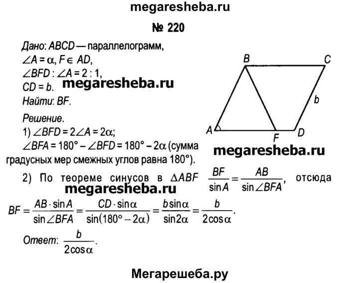 220. В параллелограмме ABCD угол A =α , CD = b. Точка F лежит на стороне AD так, что угол BFD: угол A = 2:1. Найдите длину отрезка BF.
