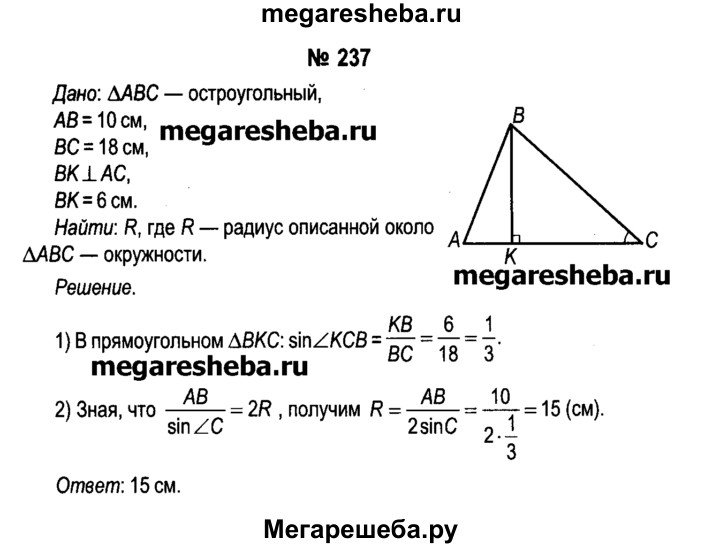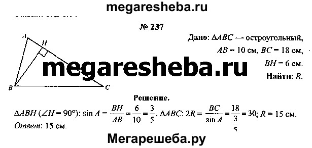 237. В остроугольном треугольнике АВС длины сторон АВ и ВС равны соответственно 10 см и 18 см. Вычислите радиус окружности, описанной около треугольника АВС, если высота, проведенная из вершины В, равна 6 см.