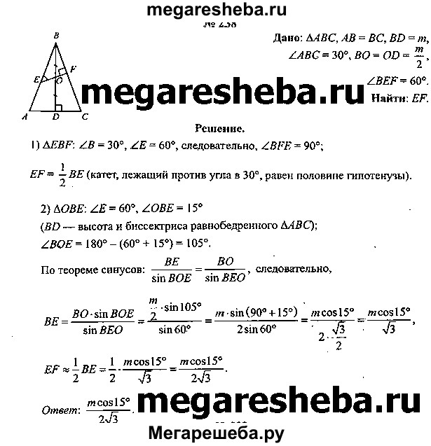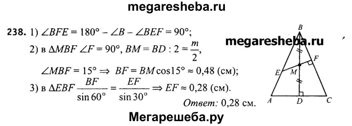 238. Высота BD, проведенная к основанию равнобедренного треугольника АВС, равна m, a угол ABC = 30°. Через середину высоты BD проведена прямая, пересекающая боковые стороны АВ и ВС в точках Е и F соответственно. Найдите длину отрезка EF, если угол BEF = 60°.