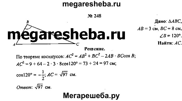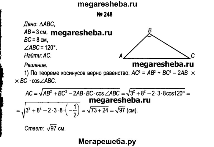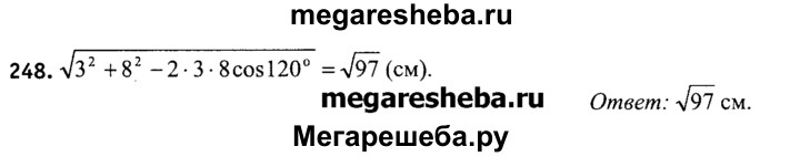 248. В треугольнике длины двух сторон равны 3 см и 8 см, а градусная мера угла между этими сторонами равна 120°. Вычислите длину третьей стороны треугольника.
