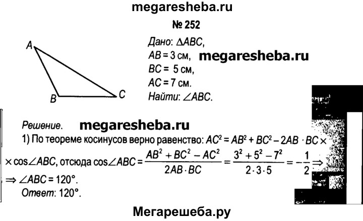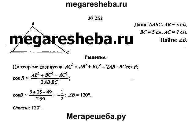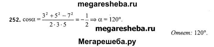 252. Длины сторон треугольника равны 3 см, 5 см и 7 см. Вычислите градусную меру угла треугольника, противолежащего большей стороне.
