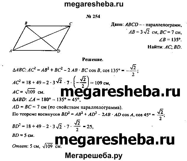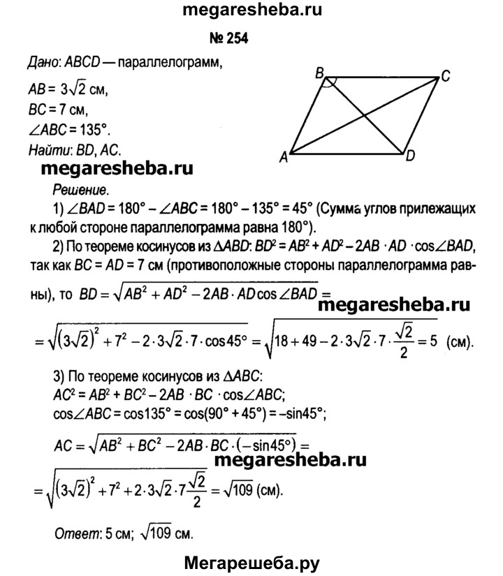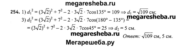254. Вычислите длины диагоналей параллелограмма, если длины его сторон равны З√2 см и 7 см, а градусная мера одного из его углов равна 135°.