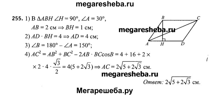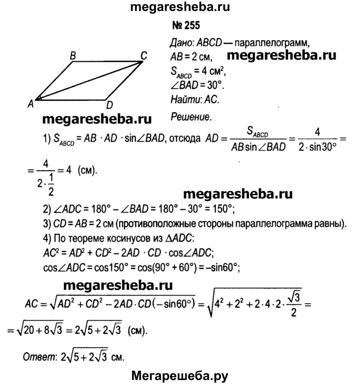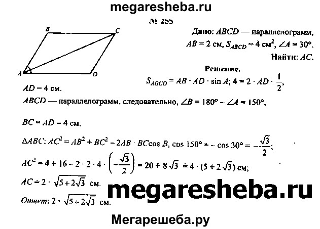 255. Длина одной из сторон параллелограмма равна 2 см, а его площадь — 4 см2. Вычислите длину большей диагонали параллелограмма, если градусная мера одного из его углов равна 30°.