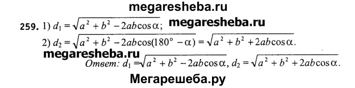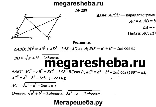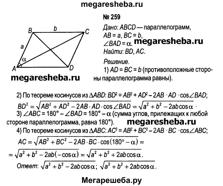 259. Длины смежных сторон параллелограмма равны а и b, а градусная мера одного из его углов равна α. Найдите длины диагоналей параллелограмма