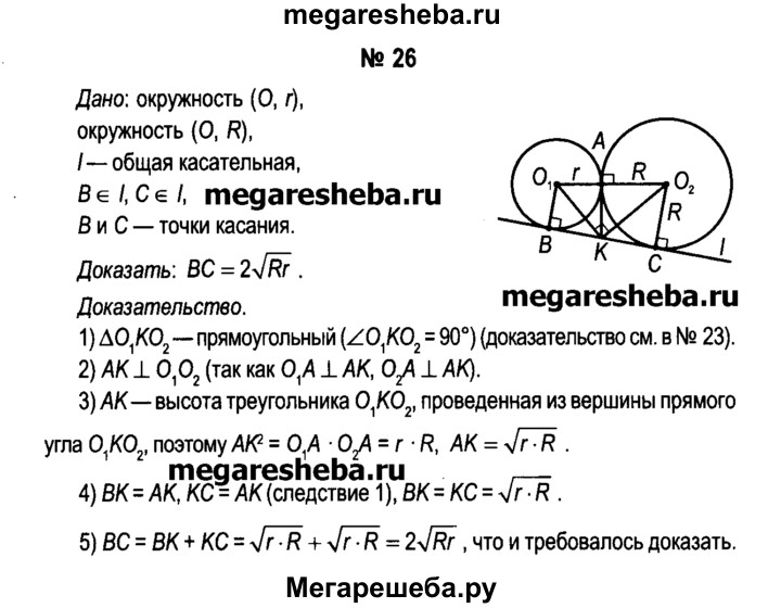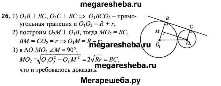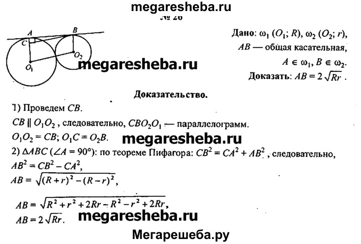26. Окружности радиусов R и r касаются внешним образом. Докажите, что отрезок их общей касательной, концами которого служат точки касания, равен 2√Rr.