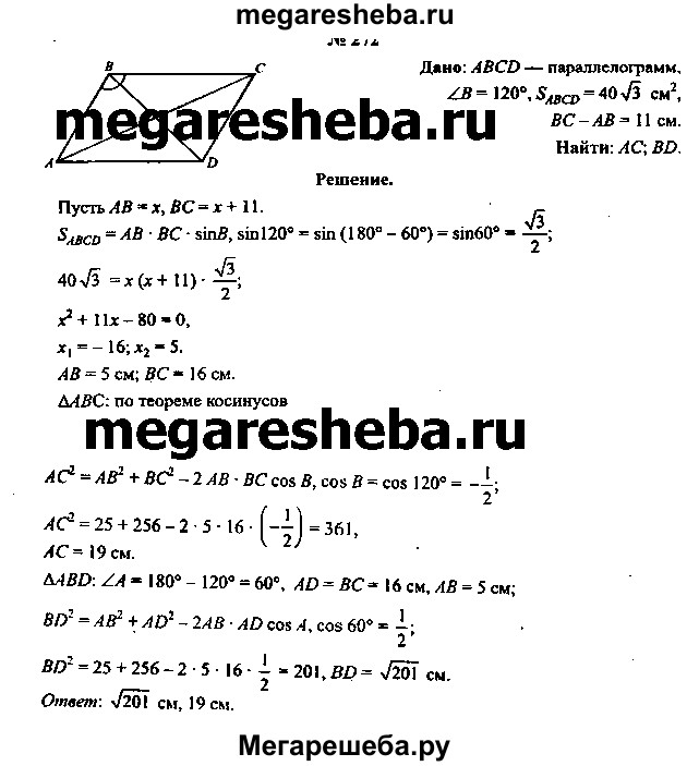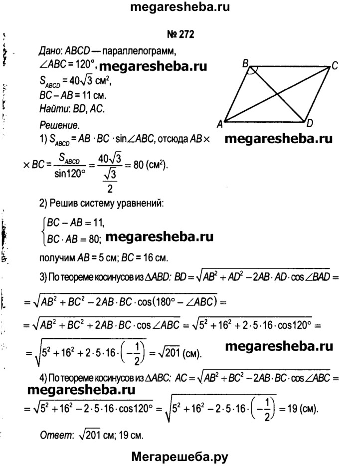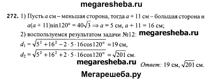 272. Площадь параллелограмма, градусная мера угла которого 120°, равна 40√3 см2, а разность длин его смежных сторон равна 11 см. Вычислите длины диагоналей параллелограмма.