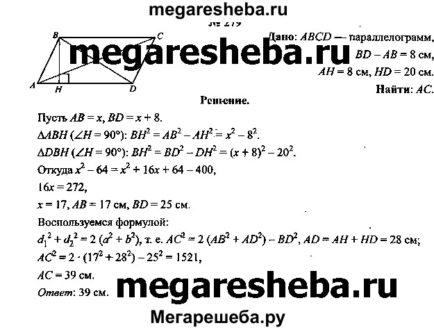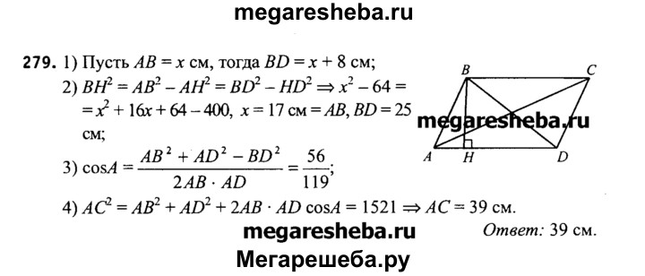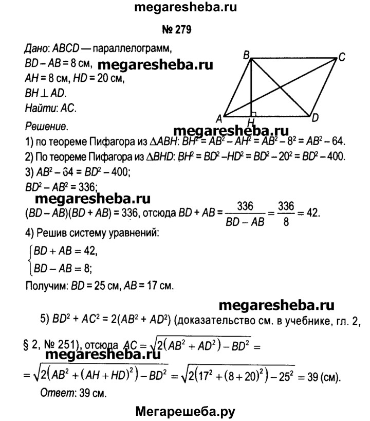 279. В параллелограмме ABCD длина диагонали BD больше длины боковой стороны АВ на 8 см, а высота, проведённая из вершины В к стороне AD, делит ее на отрезки, длины которых равны 8 см и 20 см. Вычислите длину большей диагонали параллелограмма.