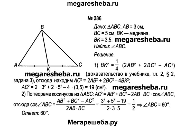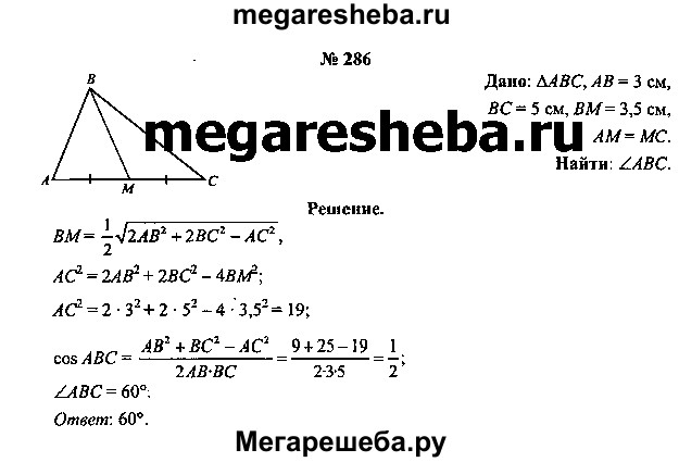 286. Длины двух сторон треугольника равны 3 см и 5 см, а длина медианы, проведенной к третьей стороне, равна 3,5 см. Вычислите градусную меру угла треугольника между заданными сторонами.