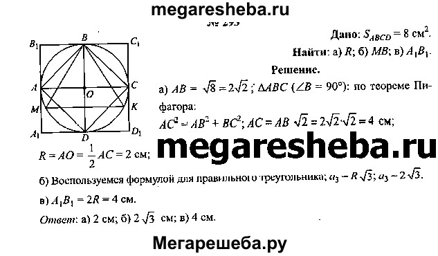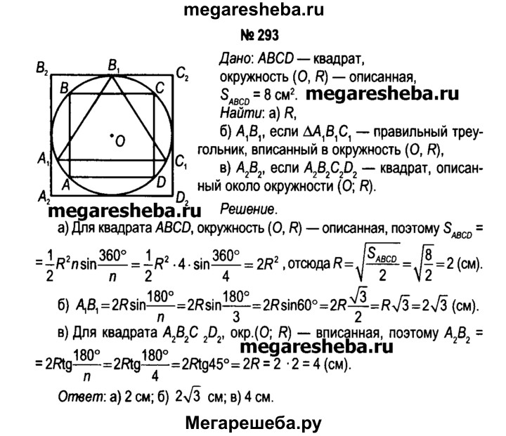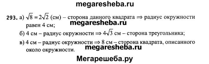 293. Площадь квадрата, вписанного в окружность, равна 8 см2. Вычислите: а) радиус этой окружности; б) длину стороны правильного треугольника, вписанного в данную окружность; в) длину стороны квадрата, описанного около данной окружности.