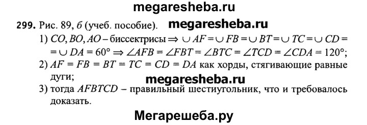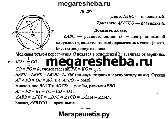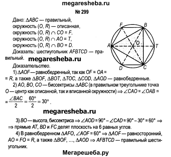 299. Правильный треугольник ABC вписан в окружность с центром в точке О. Точки F, Т и D — точки пересечения лучей СО, АО и ВО с окружностью соответственно (рис. 89, б). Докажите, что шестиугольник AFBTCD — правильный.