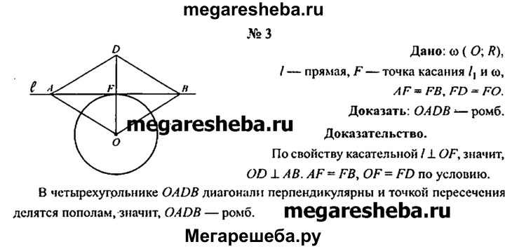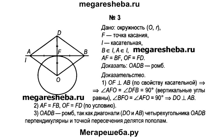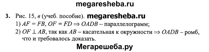 3. Прямая l касается в точке F окружности, центром которой является точка О. Точки А, В принадлежат прямой L, и AF = FB (рис. 15, е). Точка D лежит на луче OF так, что OF = FD. Докажите, что четырехугольник OADB — ромб.
