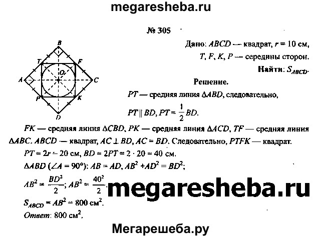 305. Точки Т, F, К и Р — соответственно середины сторон АВ, ВС, CD и DA квадрата ABCD (рис. 90, в). Вычислите площадь квадрата ABCD, если радиус окружности, вписанной в четырехугольник PTFK, равен 10 см.