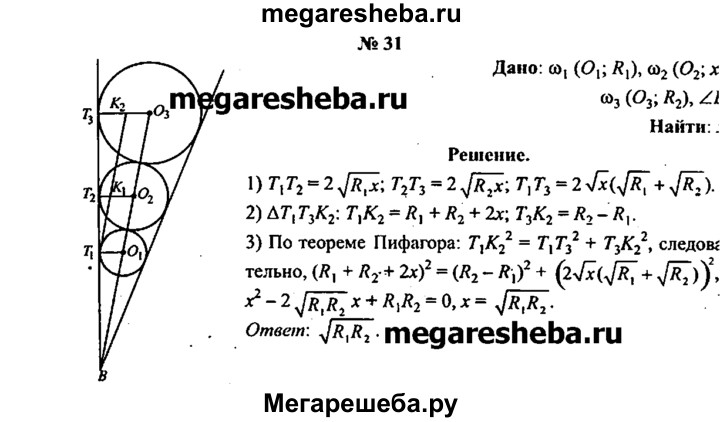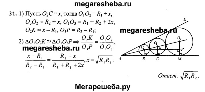 31. В угол вписаны три окружности. Средняя окружность касается двух других окружностей, радиусы которых Rx и R2. Найдите радиус средней окружности.