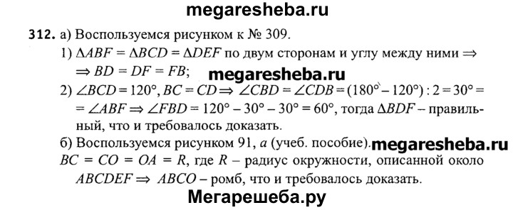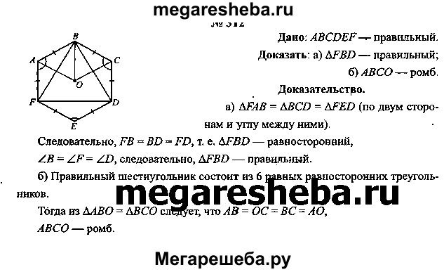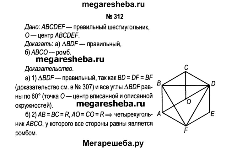 312. Точка О — центр правильного шестиугольника ABCDEF. Докажите, что: а) треугольник BDF — правильный; б) четырехугольник АВСО — ромб.