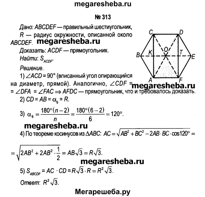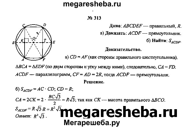 313. Радиус окружности, описанной около правильного шестиугольника ABCDEF, равен R. Докажите, что четырёхугольник ACDF является прямоугольником. Найдите площадь прямоугольника ACDF (рис. 91, а).