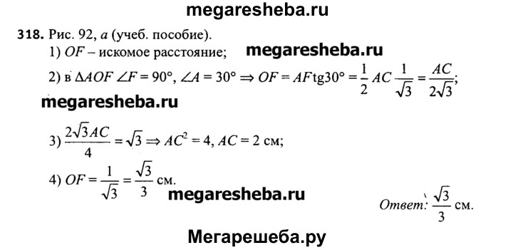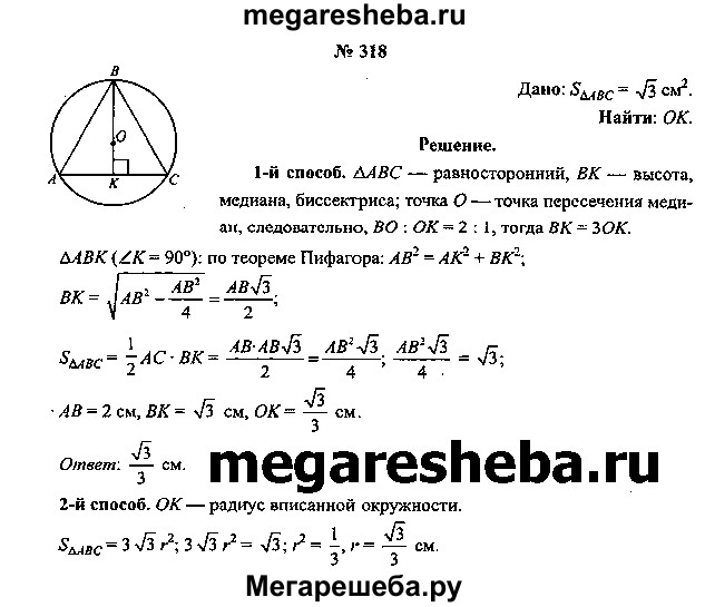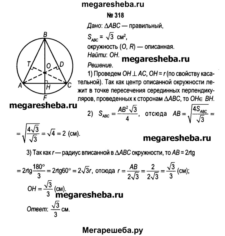 318. Площадь правильного треугольника АВС равна √3 см2. Вычислите расстояние от центра О описанной около треугольника окружности до прямой, содержащей его сторону (рис. 92, а).
