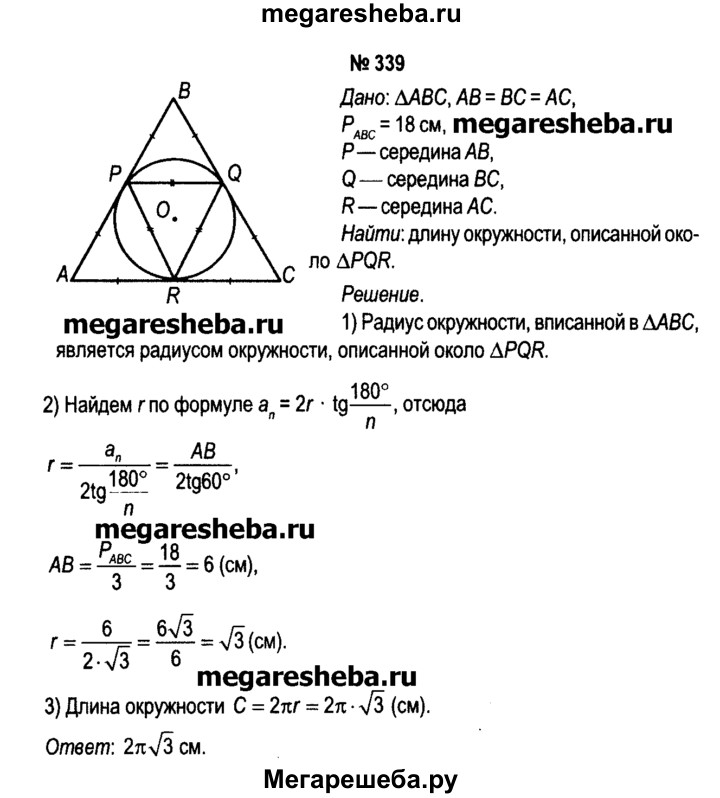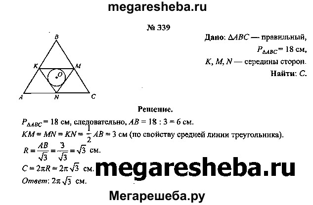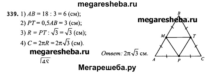 339. Периметр правильного треугольника равен 18 см. Вычислите длину окружности, описанной около треугольника, вершинами которого служат середины сторон данного правильного треугольника.