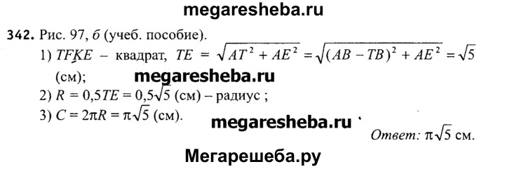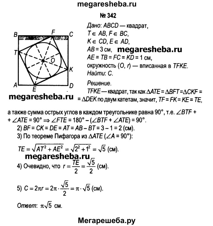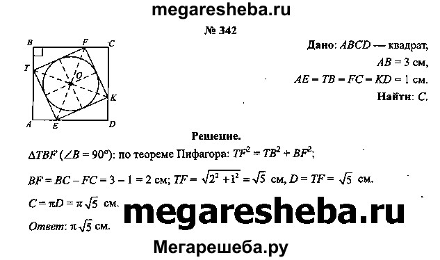 342. Точки Т, F, К и Е лежат соответственно на сторонах АВ, ВС, CD и AD квадрата ABCD. Вычислите длину окружности, вписанной в четырехугольник TFKE, если АВ = 3 см и АЕ = ТВ = FC = KD = 1 см (рис. 97, б).