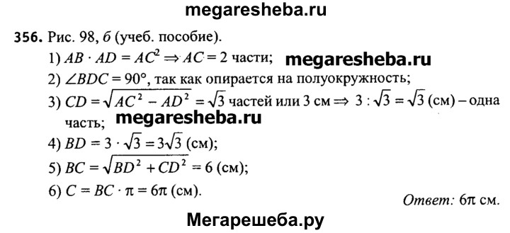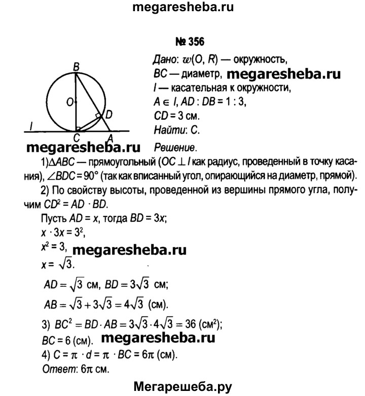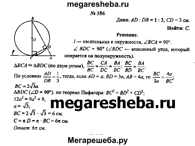 356. Отрезок ВС — диаметр окружности, центром которой является точка О. Прямая l касается окружности в точке С, А ϵ l (рис. 98, б). Отрезок АВ пересекает окружность в точке D так, что AD: DB = 1:3. Вычислите длину окружности, если CD = 3 см.