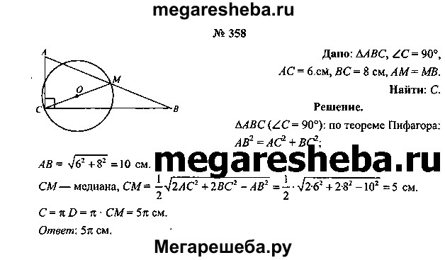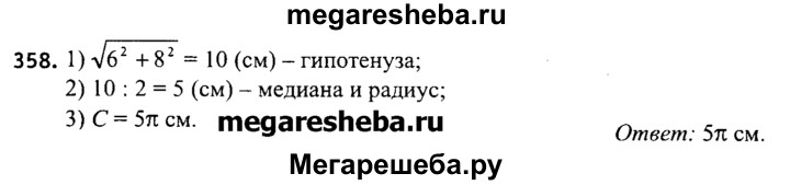 358. Длины катетов прямоугольного треугольника равны 6 см и 8 см. Вычислите длину окружности, диаметром которой является медиана, проведенная к гипотенузе.