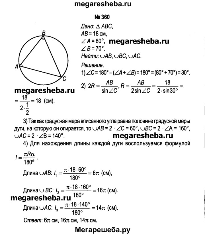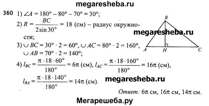 360. Длина стороны треугольника равна 18 см, а градусные меры прилежащих к ней углов равны 70° и 80°. Вычислите длины дуг, на которые вершины треугольника делят описанную около чего окружность.