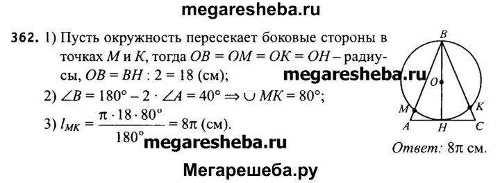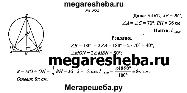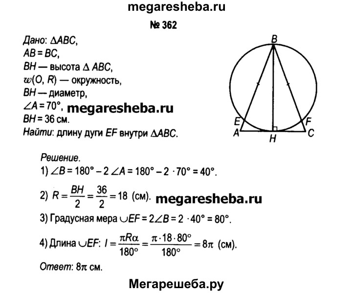 362. Высота, проведенная к основанию равнобедренного треугольника, является диаметром окружности. Вычислите длину дуги окружности, расположенной внутри треугольника, если градусная мера угла при основании треугольника равна 70°, а его высота, проведенная к основанию, равна 36 см.