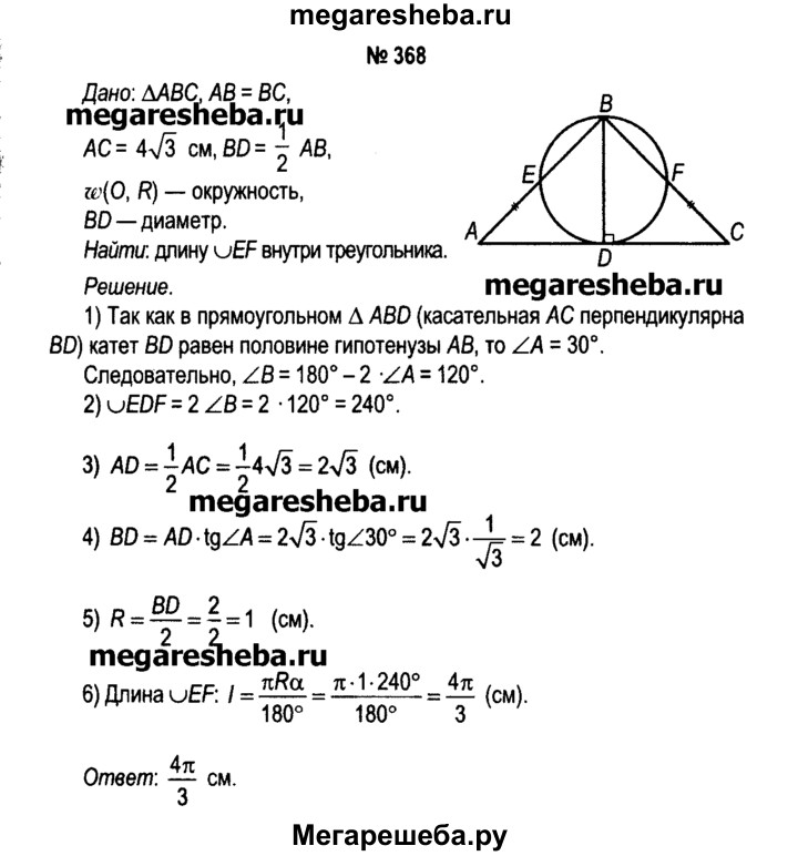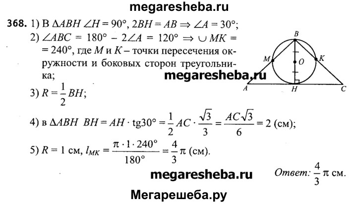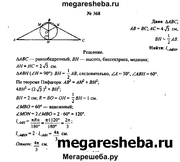 368. Длина основания равнобедренного треугольника равна 4√З см, а высота, проведенная к его основанию, в два раза меньше боковой стороны. Эта высота является диаметром окружности. Вычислите длину дуги окружности, расположенной внутри треугольника.