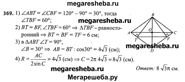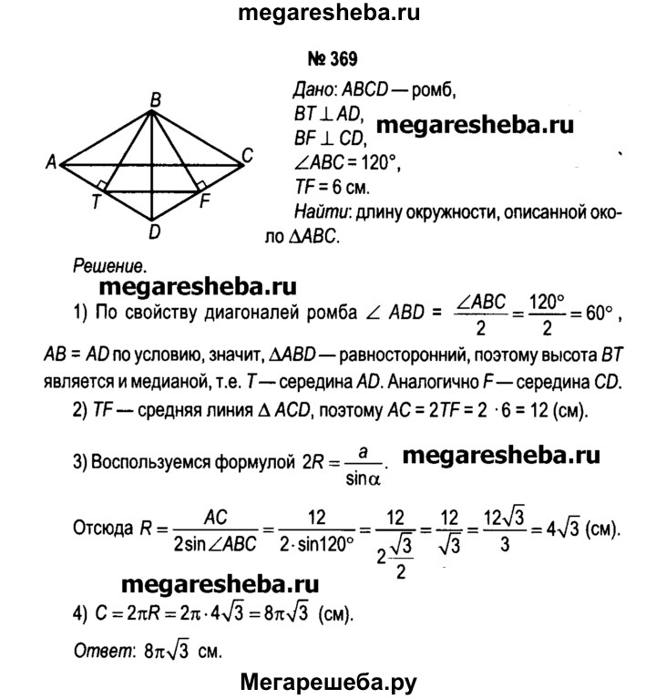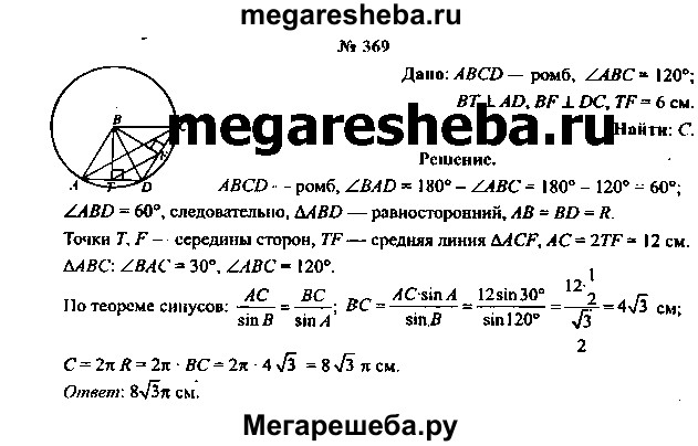 369. Отрезки ВТ и BF — высоты, проведенные из вершины тупого угла ромба ABCD к его сторонам. Вычислите длину окружности, описанной около треугольника АВС, если угол ABC = 120°, а расстояние между основаниями проведенных высот равно 6 см.