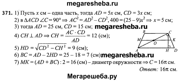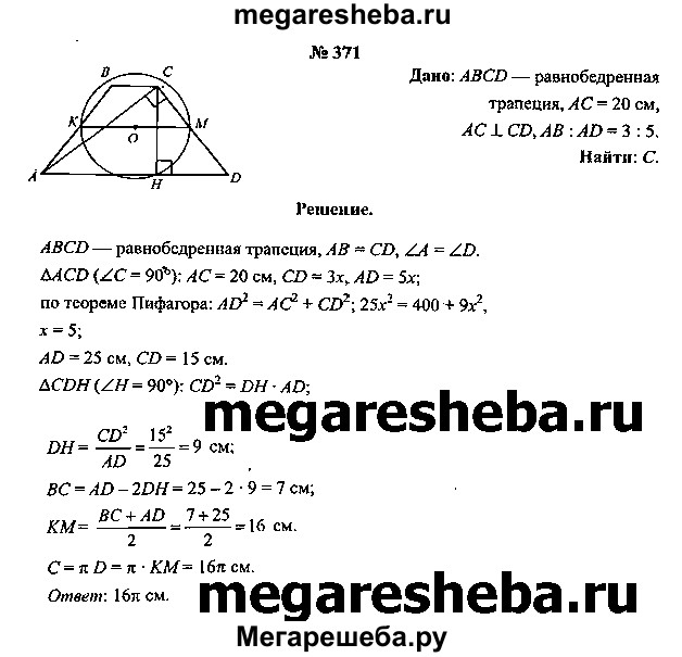 371. Диагональ равнобедренной трапеции, длина которой равна 20 см, перпендикулярна боковой стороне. Вычислите длину окружности, диаметром которой является средняя линия трапеции, если отношение длин боковой стороны и большего основания равно 3:5.