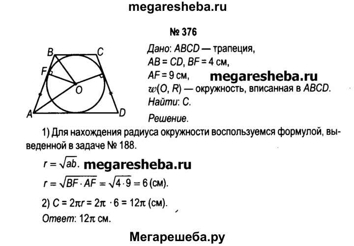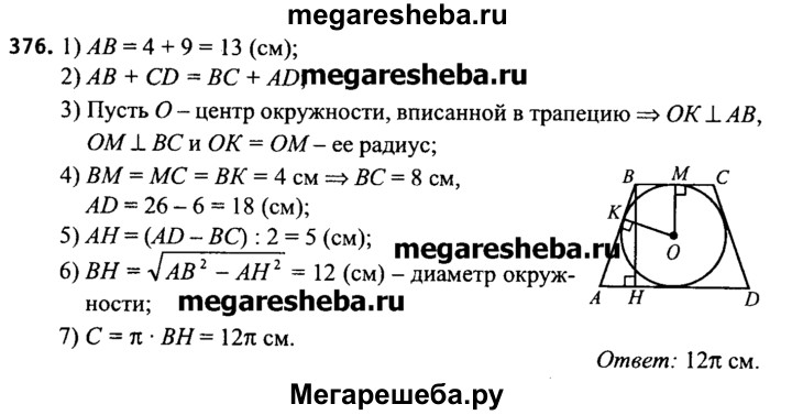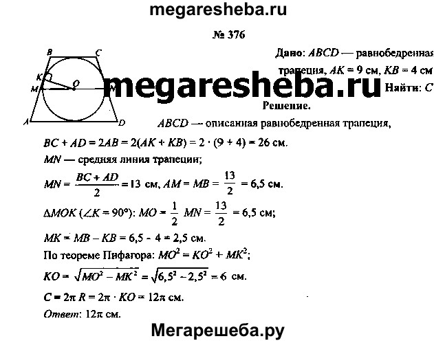 376. Окружность вписана в равнобедренную трапецию, а ее боковая сторона точкой касания делится на отрезки, длины которых равны 4 см и 9 см. Вычислите длину окружности, вписанной в трапецию.
