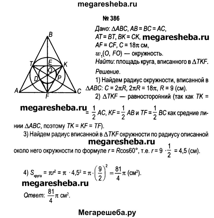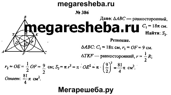 386. В равностороннем треугольнике АВС точки Т, K и F — середины сторон АВ, ВС и АС соответственно (рис. 106, б). Вычислите площадь круга, вписанного в треугольник TKF, если длина окружности, вписанной в треугольник АВС, равна 18 π см.