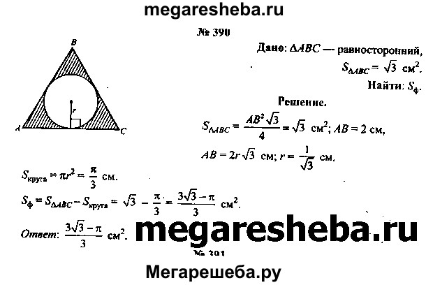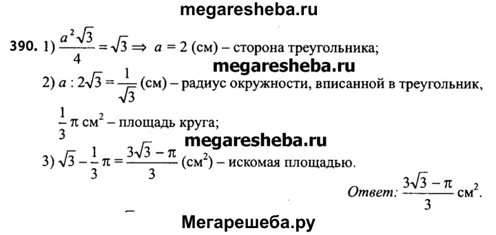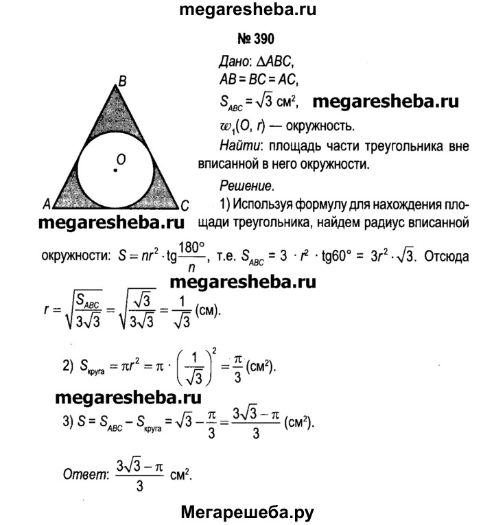390. Площадь равностороннего треугольника равна √3 см2. Вычислите площадь части треугольника, лежащей вне вписанной в него окружности.