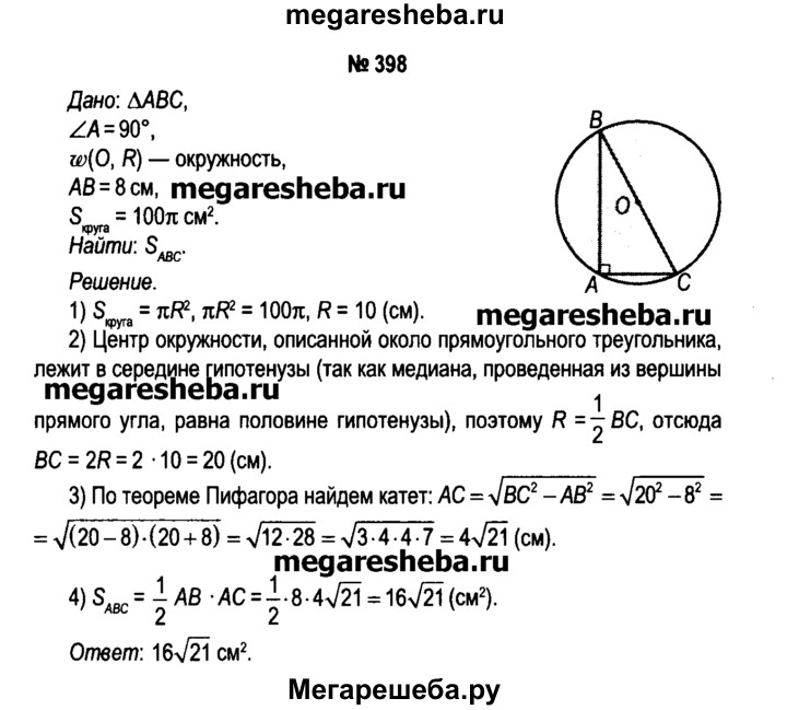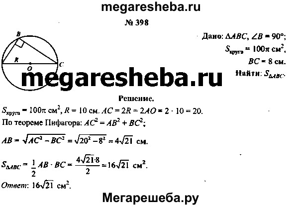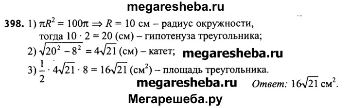 398. Площадь круга, ограниченного окружностью, описанной около прямоугольного треугольника, равна 100 π см2, а длина одного из катетов треугольника — 8 см. Вычислите площадь этого треугольника.