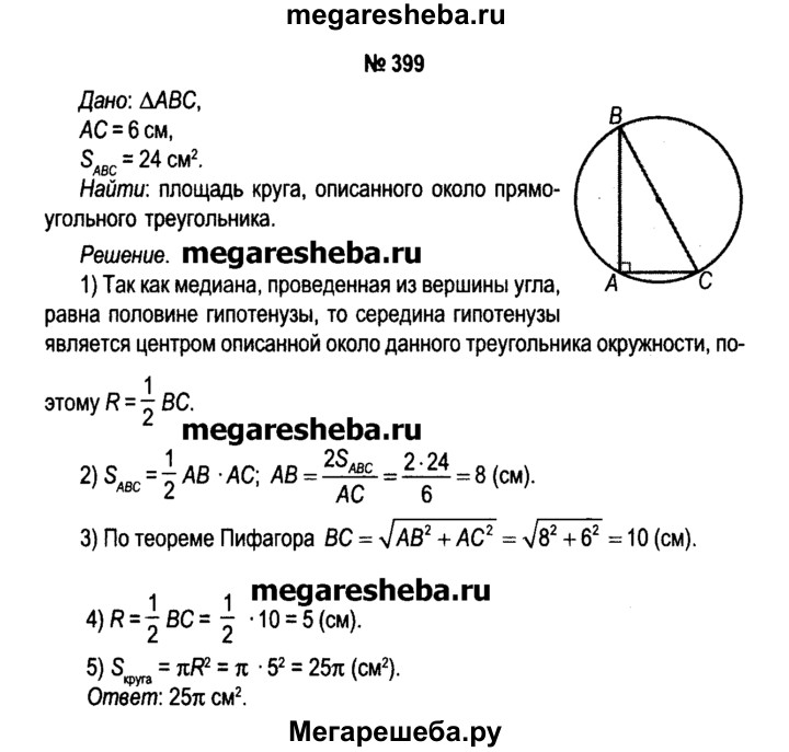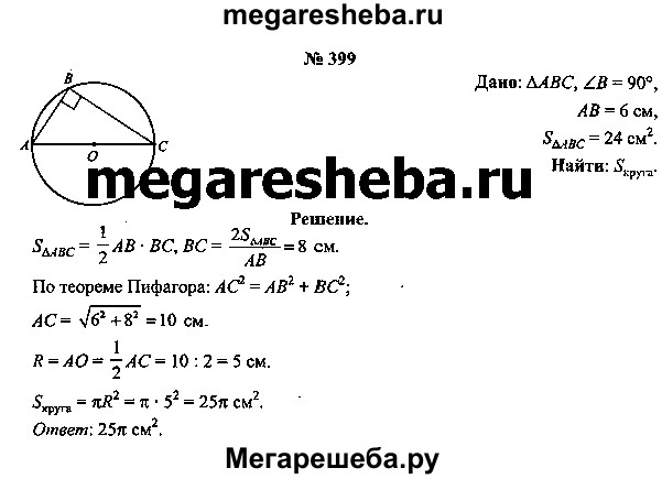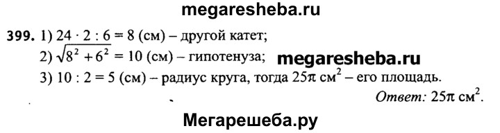 399. Длина одного из катетов прямоугольного треугольника равна 6 см, а его площадь — 24 см2. Вычислите площадь круга, ограниченного окружностью, описанной около этого прямоугольного треугольника.