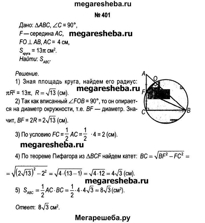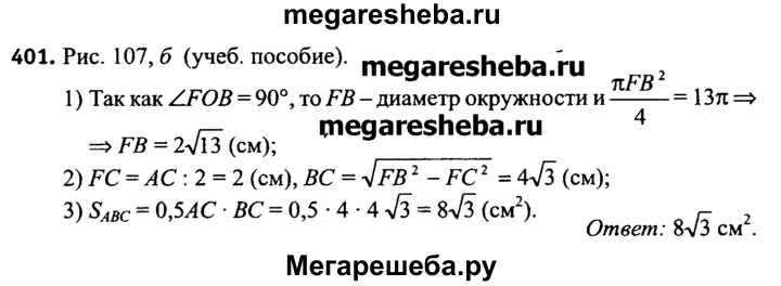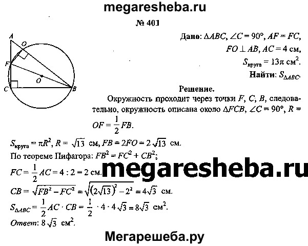 401. Точка F — середина стороны АС прямоугольного треугольника АВС, отрезок FO — перпендикуляр, проведенный к гипотенузе АВ, АС = 4 см (рис. 107, б). Вычислите площадь треугольника АВС, если площадь круга, ограниченного окружностью, описанной около четырехугольника CFOB, равна 13 π см2.