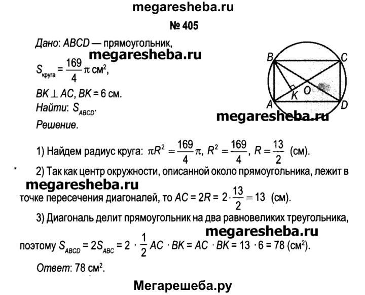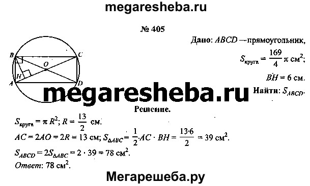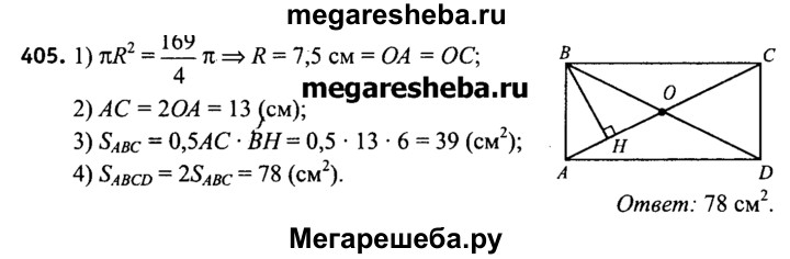 405. Площадь круга, ограниченного окружностью, описанной около прямоугольника ABCD, равна 169/4 π см2. Расстояние от вершины В до прямой, содержащей диагональ АС, равно 6 см. Вычислите площадь прямоугольника.
