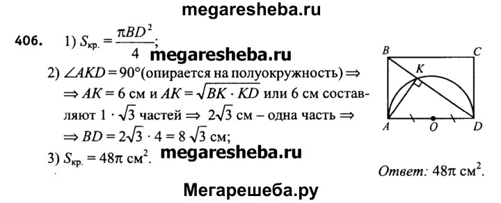 406. На стороне AD прямоугольника ABCD как на диаметре построена окружность, которая пересекает диагональ BD в точке К так, что DK: KB = 1:3. Длина перпендикуляра, проведенного из точки А к диагонали BD, равна 6 см. Вычислите площадь круга, ограниченного окружностью, описанной около прямоугольника.